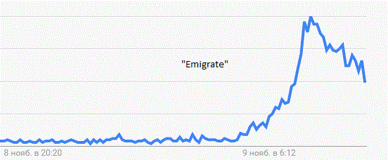 Как следует из данных Google, в США наблюдается взрывной рост поисковых запросов с ключевыми словами «эмигрировать» и «как эмигрировать в Канаду». Большое количество людей начало искать «конец света», а веб-сайт правительства Канады не выдержал наплыва посетителей и ушел в офлайн. Напомним, что социологи в среднем оценивали шансы господина Трампа на победу всего в 10%. Источник: ProFinance.Ru - Новости рынка Форекс