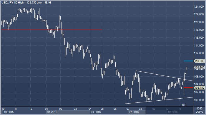 Еще 9 ноября, вдохновившись победой Дональда Трампа на выборах в США, стратеги Credit Agricole купили доллар США против иены с целью на 110.00 и стопом на 99.00. Эксперты банка сделали ставку на то, что аппетит к риску будет оставаться устойчивым и, как видно, не прогадали. На следующий день Credit Agricole передвинул стоп с 99.00 на 101.40. Сегодня эксперты банка еще раз повысили приказ на ограничение убытка, переместив его в безубыточную зону.