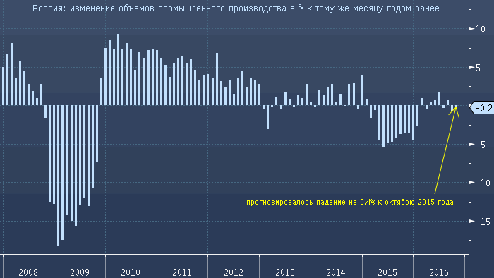 Тем не менее, по сравнению с октябрем 2015 года в октябре 2016 года промышленное производство сократилось на 0.2%.