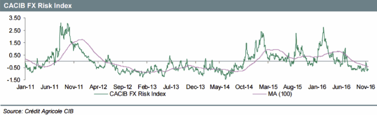 Аналитики Credit Agricole CIB отмечают, что рассчитываемый ими индекс риска после выборов в США снизился и вновь находится на близких к многолетним минимумам уровнях, отражая последние изменения на рынках. В банке обращают внимание на то, что рост надежд на более сильный рост экономики и укрепление доллара не оказывают негативного влияния на инфляционные ожидания, которые также возросли, что может предполагать значительный уровень оптимизма.