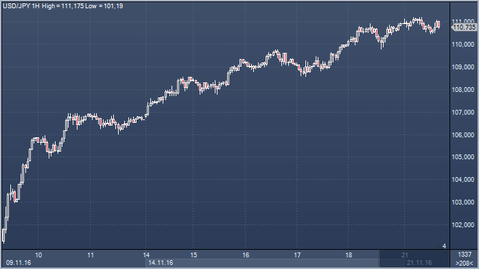 Поэтому более устойчив сегодня доллар США к иене, взяв паузу после 10-дневного ралли. Иена падает из-за ожиданий сохранения крайне мягкой денежно-кредитной политики в Японии, говорят аналитики. Вероятность увеличения процентной ставки в США в декабре оценивается рынком почти в 100%. В настоящий момент, согласно данным CME Group, инвесторы оценивают вероятность повышения ставки ФРС в декабре в 95.4%, тогда как в пятницу она составляла 90.6%. Доллар растет последние 10 сессий подряд, долларовый индекс прибавил 4.6%, поднявшись до самого высокого уровня с апреля 2003 года. Его росту способствовали ожидания стимулирования экономики США новой администрацией во главе Дональдом Трампом, который неоднократно говорил о планах повысить госрасходы, включая затраты на инфраструктуру. Иена за последние две недели потеряла 7% к доллару, продемонстрировав самое существенное падение с 1988 года. Экономисты прогнозируют дальнейшего снижения курса японской валюты, поскольку спрэд в доходности облигаций будет увеличиваться. В Японии ЦБ обещал удерживать доходность 10-летних бондов возле 0%. В США такие же бумаги приносят доход в 2.33% в год. Но это будет, скорее всего, после коррекции. "Мы видели резкие движения за последние две недели на фоне ожиданий по ФРС, и я думаю, что это не может продолжаться долго", - заявил главный рыночный стратег IG Ltd, Крис Уэстон. Источник: ProFinance.Ru - Новости рынка Форекс