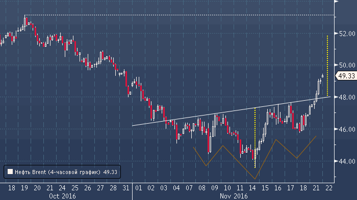 Декабрьский контракт на нефть WTI экспирировался в понедельник, реализовав рост в 3.9%. После этого сменивший его в качестве активного январский контракт на WTI прибавил в цене 1.1%. Январский фьючерс на Brent также дорожает к котировкам закрытия вчерашнего торгового дня. Очевидно, что риторика вокруг судьбоносного соглашения о сокращении объемов производства ОПЕК впервые с 2008 года, которое должно быть достигнуто на официальном саммите в конце ноября, будет являться ключевым драйвером в течение всей недели. Статистика по запасам в США, скорее всего, будет проигнорирована в свете текущего фокуса рынка. С технической точки зрения, краткосрочный потенциал в ценах на Brent указывает на возможность роста до 52 долларов за баррель при условии устойчивости поддержки на уровне 48 долларов за баррель. Источник: ProFinance.Ru - Новости рынка Форекс