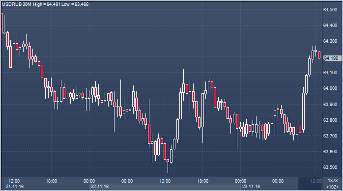 Таким образом, по официальному курсу ЦБ доллар вырос к рублю на 38 копеек, а евро вырос к рублю на 51 копейку по сравнению с официальным курсом среды. Объем сделок на Московской бирже к 12:47 мск среды составил 802.3543 млрд рублей или 12 610.0421 млн долларов. Курс рубля плавно снижался с момента открытия биржи в 10:00 мск из-за легкой нисходящей коррекции цен нефти. Цены на нефть и рубль корректируются, поскольку завтра в США празднуется День благодарения, и по традиции американские трейдеры берут 4 дня выходных. Нефть дорожала на ожиданиях сделки ОПЕК. Встречи картеля состоится 30 ноября в Вене. Если соглашение будет достигнуто, рост цен на нефть продолжится к максимумам в районе $53. Вырастет и курс рубля. Источник: ProFinance.Ru - Новости рынка Форекс