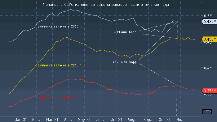 Тема ОПЕК, очевидно, остается доминирующей на рынке, поэтому американская статистика по запасам нефти остается в тени. Согласно данным Минэнерго США, за неделю до 18 ноября коммерческие запасы нефти неожиданно сократились на 1.255 млн. баррелей, в то время как прогноз экспертов предполагал увеличение на 289.7 тыс. баррелей. В тоже время запасы бензина увеличились на 2.317 млн. баррелей, хотя прогнозные оценки подразумевали роста показателя на 725 тыс. баррелей. Еженедельный объем добычи нефти в США увеличился к предыдущей неделе совсем незначительно — с 8.68 до 8.69 млн. баррелей в сутки.