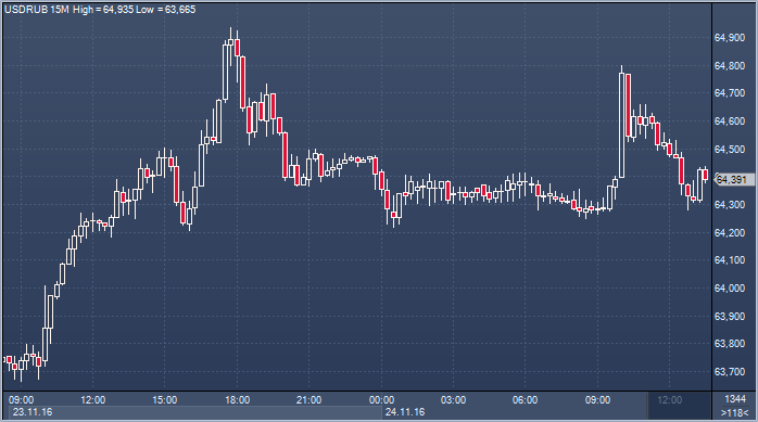 Таким образом, по официальному курсу ЦБ доллар вырос к рублю на 62 копейки, а евро вырос к рублю на 3 копейки по сравнению с официальным курсом четверга. Объем сделок на Московской бирже к 13:36 мск четверга составил 271.4081 млрд рублей или 4 240.1759 млн долларов. Курс рубля незначительно снизился при открытии торгов, но к настоящему моменту отыграл все потери и вышел в небольшой плюс. Сегодняшний день может обойтись без тенденции, поскольку в США празднуется День благодарения, торгов не проводится. Рубль в ближайшие дни будет полностью зависеть от того, куда пойдет нефть и какие решения примет ОПЕК. Источник: ProFinance.Ru - Новости рынка Форекс