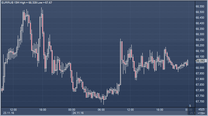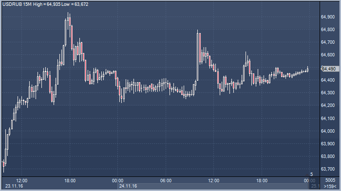 По итогам торгов в четверг 24 ноября курс доллара по отношению к рублю символически вырос на 3 копейки и составил 64.49 за единицу американской валюты. Курс евро увеличился на 10 копеек до 68,07 рубля за единицу европейской валюты (прим. ProFinance.ru: по состоянию на 23:50 мск)