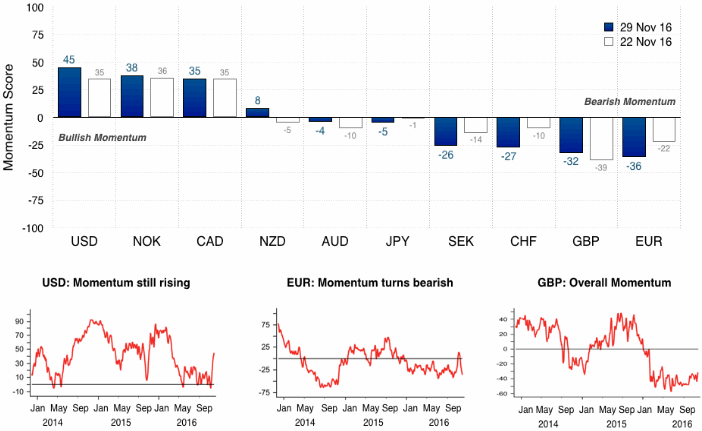 Валютные стратеги BNP Paribas обновили регулярно публикуемую оценку текущей ситуации на валютном рынке, сгенерированную системой FX Momentum. Как следует из ее названия, система оценивает силу валютных трендов, исходя из текущей динамики валютных курсов (FX Momentum), рыночных ставок (Momentum Rates) и поведения фондового рынка (Equity Momentum). Сила тренда основных валют оценивается по совокупности компонентов (Overall Momentum) по шкале от -100 (сильнейший медвежий моментум) до +100 (сильнейший бычий моментум).