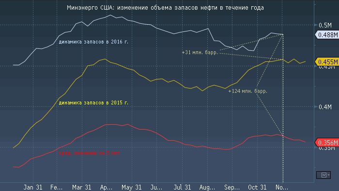 Рынок не заметил отчет Минэнерго США по запасам нефти в этой стране, поскольку все внимание сегодня полностью адресовано встрече ОПЕК в Вене. У трейдеров просто не остается эмоциональных сил реагировать на что-то еще. Картель достиг соглашения ограничить добычу, и сейчас все ждут начала-пресс конференции, где официально будут объявлены итоги саммита. Ранее агентство Блумберг со ссылкой на делегатов на саммите сообщило, что ОПЕК достигла соглашения об уменьшении добычи нефти на 1.2 миллиона баррелей, до 32.5 миллиона баррелей в сутки. Картель планирует встречу с другими производителями 9 декабря. У рынка еще будет шанс разочароваться, как нам кажется, поскольку в Минэнерго России заявили, что 600 000 баррелей, которые ОПЕК просит сократить страны, не входящие в организацию — это слишком много.