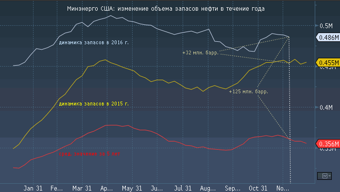 Цены на нефть первоначально пребывали в нерешительности, не зная как реагировать на смешанный отчет по коммерческим запасам нефти в США, однако к настоящему моменту сформировалась нисходящая динамика. Итак, запасы, исключая стратегический резерв, за неделю, завершившуюся 2 декабря, упали на 2.4 миллиона баррелей, или на 0.5% - до 485.8 миллиона баррелей, следует из недельного отчета Управления энергетической информации Минэнерго страны. Аналитики, опрошенные агентством Reuters, ждали сокращения на 1.032 миллиона баррелей, до 487.068 миллиона баррелей. Добыча нефти в США за эту неделю, по данным ведомства, сократилась на 0.02%, или на 2 тысячи баррелей в сутки, до 8.697 миллиона баррелей в сутки. На этом бычьи новости заканчиваются.