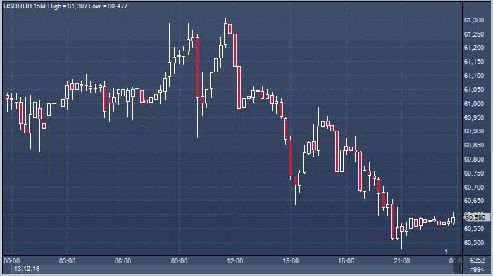 По итогам торгов во вторник 13 декабря курс доллара по отношению к российской валюте упал на 47 копеек и составил 60.58 за единицу американской валюты. Курс евро снизился на 57 копеек до 64.36 рубля за единицу европейской валюты (прим. ProFinance.ru: по состоянию на 23:50 мск)