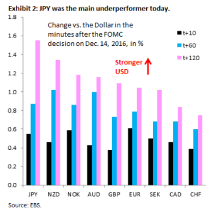 На валютном рынке иена стала главной жертвой укрепления доллара после объявления решения FOMC о повышении ставке, что вполне понятно, учитывая стимулирующую Банка Японии в условиях повсеместно растущей доходнсоти. В связи с этим аналитики Goldman Sachs делают ставку на дальнейшее ослабление японской валюты и понимают прогнозы по доллар/иене до 118.00, 120.00 и 125.00 на три, шесть и двенадцать месяцев соответственно.