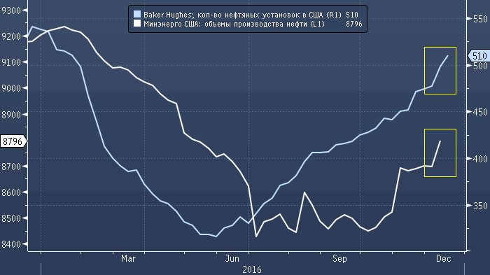 Если на предыдущей неделе количество нефтяных установок выросло на 21 штуку, то на этой неделе показатель увеличился на 12. Итого: +33 установки за 2 недели. Это весьма впечатлительный рост. При этом согласно статистике Минэнерго США, объем производства за неделю со 2 по 9 декабря увеличился на 99 тыс. до 8.796 млн. баррелей в день. Дополнительные 12 установок за текущую неделю еще не успели внести свой вклад в это увеличение производства, поэтому, можно предположить, что публикация статистики Минэнерго на предстоящей неделе отразит эффект увеличения буровых на неделе нынешней. Источник: ProFinance.Ru - Новости рынка Форекс
