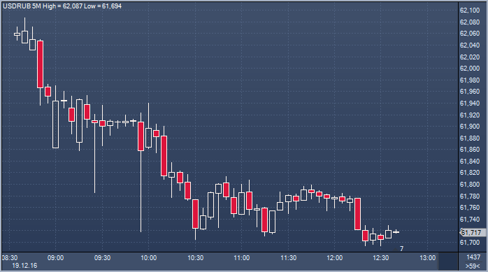 | 19.12.16 12:23 | Danske Bank прогнозирует падение курса доллара к рублю до 53.20 в течение 12 месяцев | 19.12.16 13:28 | Sberbank CIB ждет, что евро/доллар вернется к 1.05 |