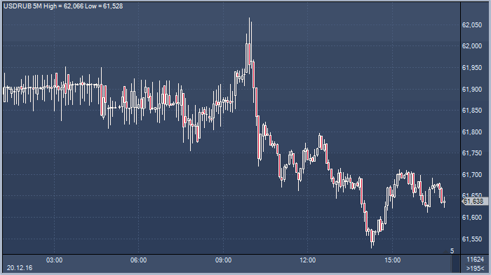 Курс доллара к рублю на ранних торгах предпринял попытку закрепиться выше уровня 62.00, но безуспешно. В ходе торгов на Московской бирже курс доллар/рубль при поддержке стабильных цен на нефть смог реализовать нисходящую динамику и протестировать на прочность отметку 61.55. Пока она российской валюте «не по зубам». В моменте цены консолидируются в районе 61.65 рубля за доллар.