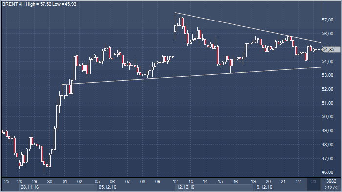 Сегодня последний торговый день текущей недели, последний торговый день перед Рождеством в США и Европе. Ключевым событием дня станет публикация еженедельных данных нефтегазовой сервисной компании Baker Hughes по количеству активных буровых установок в США, но по времени она состоится настолько поздно, что на рынке уже не останется игроков, которые будут реагировать на опубликованные цифры. Следующая неделя будет предновогодней. Однако текущая история в ценах на нефть — это уже не история данных Baker Hughes, данных по запасам в США, которые будут опубликованы на следующей неделе, или каких-либо иных факторов. Цены на нефть нашли для себя комфортный диапазон, в котором, что бы ни случилось, они будут пребывать до конца года. Лишь с наступлением января, отдохнув после праздников и поднакопив силы, рынок начнет сравнивать, насколько реально будут сокращены поставки со стороны ОПЕК+ и как на это будут реагировать увеличением объемов производства представители сланцевой отрасли в США. Вся история оставшихся в этом году торговых дней заключена в двухдолларовый диапазон между 53.50 и 55.50. Если цены при условии низкой ликвидности случайно уйдут до 53 или 56 долларов за баррель (Brent), то тут же будут возвращаться внутрь ранее озвученного диапазона. Источник: ProFinance.Ru - Новости рынка Форекс