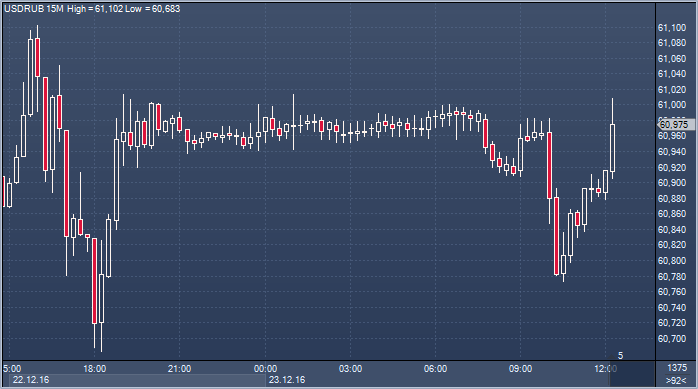 Таким образом, по официальному курсу ЦБ доллар снизился к рублю на 1 копейку, а евро упал к рублю на 2 копейки по сравнению с официальным курсом пятницы. Объем сделок на Московской бирже к 12:27 мск пятницы составил 775.2720 млрд рублей или 12 737.7558 млн долларов. Курс рубля активно рост с открытия в первый час торгов, однако к настоящему моменту растерял все преимущество. Рост рубля эксперты связывают с высоким спросом на рублевую ликвидность, поскольку компании выплачивают налоги в бюджет. Нефть при этом стабильна и вряд ли претерпит какие-то изменения наряду с курсом доллара, так как торгов на западных рынков сегодня не проводится по случаю празднования католического Рождества в воскресенье. Курс рубля близок к тому, чтобы проверить на прочность уровень локального минимума доллара 60.50. Пробой вниз приведет к тестированию важного психологического уровня в 60.00 Источник: ProFinance.Ru - Новости рынка Форекс