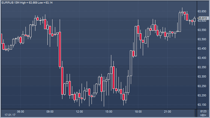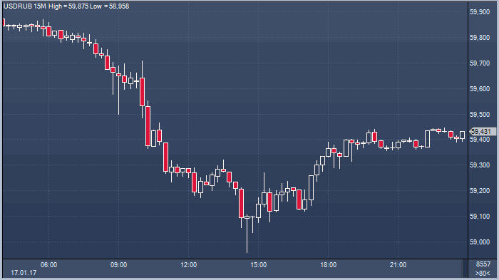 По итогам торгов во вторник 17 января курс доллара по отношению к российской валюте упал на 44 копейки и составил 59.41 за единицу американской валюты. Курс евро вырос на 12 с половиной копеек до 63.60 рубля за единицу европейской валюты (прим. ProFinance.ru: по состоянию на 23:50 мск)