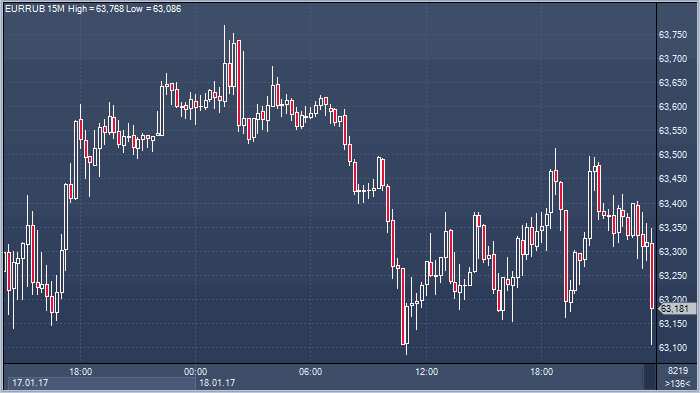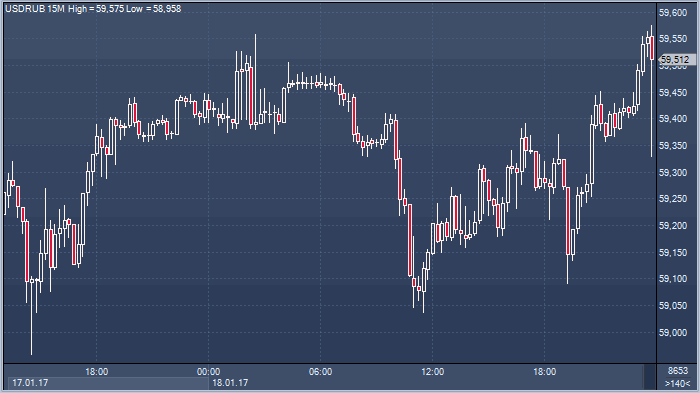 По итогам торгов в среду 18 января курс доллара по отношению к российской валюте вырос на 9 копеек и составил 59.50 за единицу американской валюты. Курс евро упал на 34 копейки до 63.26 рубля за единицу европейской валюты (прим. ProFinance.ru: по состоянию на 23:50 мск)