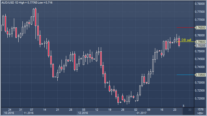 Аусси/доллар. 23 января: продажа от 0.7560, цель 0.7350, стоп 0.7650. Текущий результат +20 пунктов