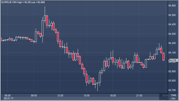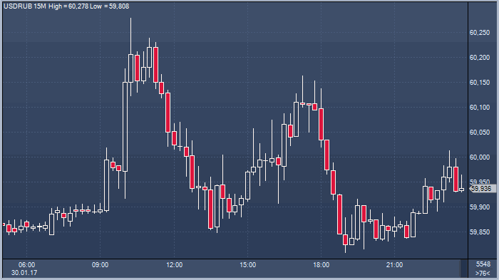 По итогам торгов в понедельник 30 января курс доллара по отношению к российской валюте вырос на 10 копеек и составил 59.93 за единицу американской валюты. Курс евро поднялся на 12 копеек до 64.09 рубля за единицу европейской валюты (прим. ProFinance.ru: по состоянию на 23:50 мск)