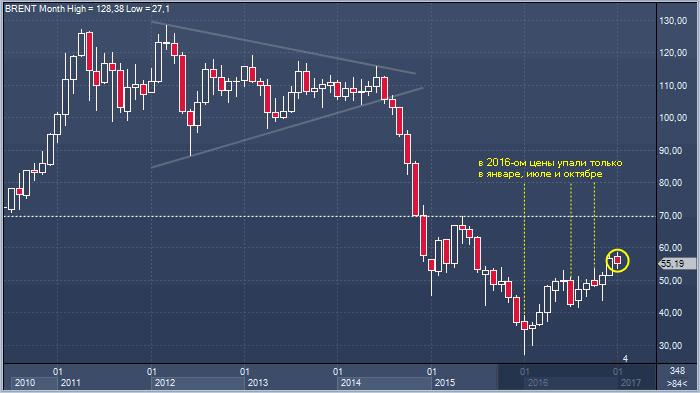 Сегодня последний торговый день первого в наступившем году месяца. Цены на нефть, очевидно, завершат этот январь первым ежемесячным снижением с октября прошлого года. Стоит отметить, что в 2016 году именно ежемесячное снижение наблюдалось только 3 раза: также в январе, затем в июле и в октябре.