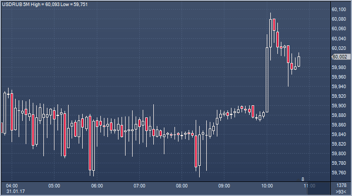 Курс рубля открылся слабым снижением, которое вряд ли можно истолковать как какое-то желание рынка. Слабость рубля, скорее всего, связана с приближением даты начала валютных интервенций Минфина против него. Первые сделки по доллару США прошли на Московской бирже в диапазоне 59.87-60.02 рубля за доллар, а через 15 минут после открытия курс составляет 60 рублей за доллар (+7 копеек к уровню предыдущего закрытия). Евро вырос до 64.1675 рубля за евро (+10.25 копейки), а стоимость бивалютной корзины прибавила 8.5 копейки по отношению к уровню закрытия понедельника, составив 61.875 рубля. Доллар при этом оказался на 16.18 копейки ниже уровня действующего официального курса, евро - на 26.58 копейки ниже официального курса. Доллар падает на международном рынке форекс против ряда валют на фоне обеспокоенности инвесторов имиграционной политикой Трампа.