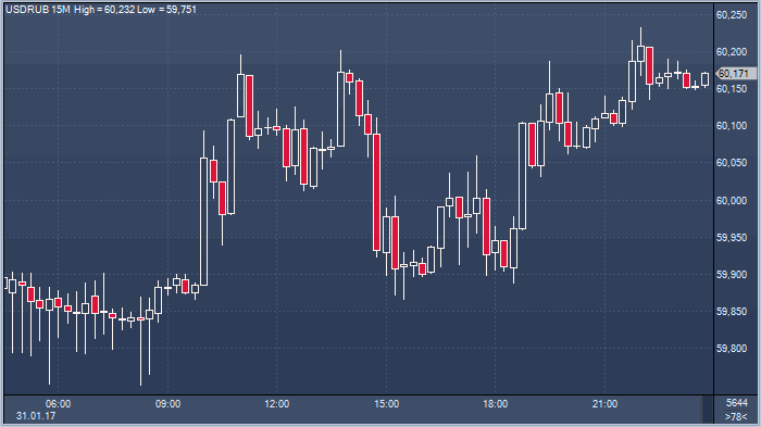 Объем торгов в валютной секции Московский биржи во вторник 31 января составил 1.552 трлн. рублей ($25.793 млрд.), что стало выше среднедневного объема предыдущих двух месяцев.