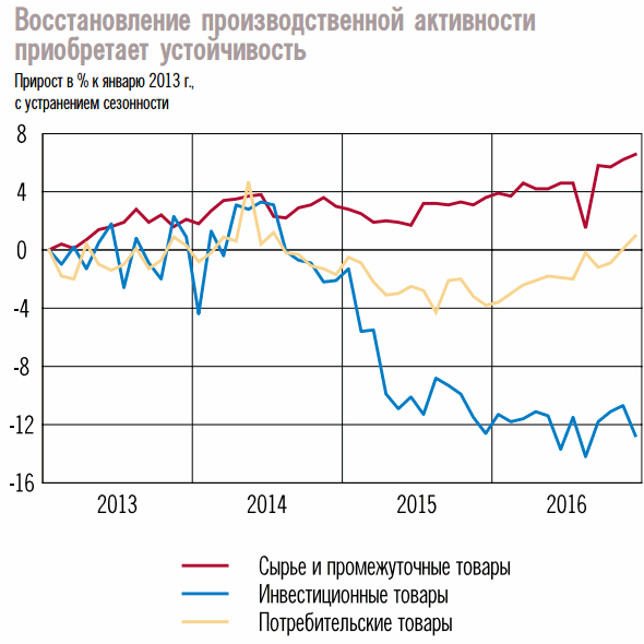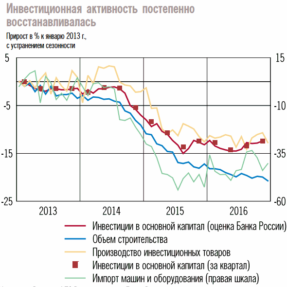 С другой стороны, импорт инвестиционных товаров, по предварительным оценкам, снова начал расти. В результате, по оценкам Банка России, годовой темп прироста инвестиций в основной капитал в IV квартале 2016 г. был близок к нулю.