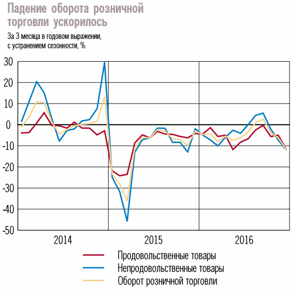 С устранением сезонного фактора ускорилось падение оборота розничной торговли, наблюдаемое с октября после небольшого роста в 3 квартале. При этом сократился объем продаж как продовольственных, так и непродовольственных товаров, в том числе длительного пользования.