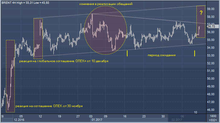 На представленном ниже 4-часовом графике отображен период динамики цен на нефть сорта Brent с момент подписания 30 ноября внутреннего соглашения ОПЕК об ограничении объемов производства и по настоящий момент.