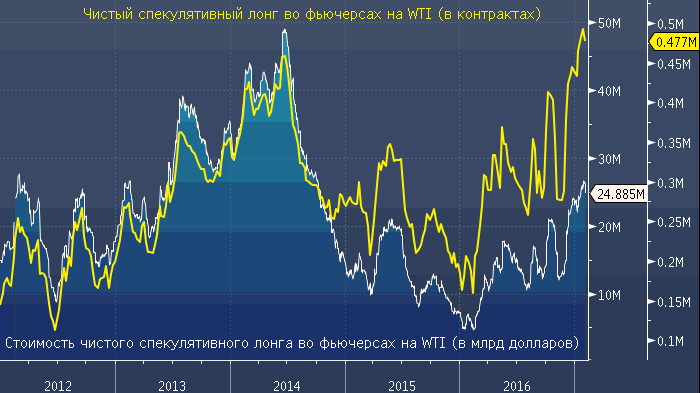 Как мы помним, цены на нефть (ProFinance.ru: для простоты будем говорить о WTI, хотя ситуация с Brent аналогична) достигли дна в области $30 в начале прошлого года и с тех пор корректируются выше. Вместе с ними растет и объем чистого спекулятивного лонга во фьючерсах, который в самом начале этого года достиг исторического максимума и так там и остается.