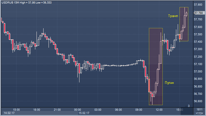 Рубль увеличил темпы падения после того, как в Твиттере президента США Дональда Трампа появилось сообщение относительно Крыма и России «Крым стал российским при Обаме. Был ли Обама излишне мягок к России?» - написал Трамп в своем микроблоге. В своих утренних комментариях мы предупреждали, что геополитический вектор сегодня может недружелюбно сместиться в отношении рубля. Основанием для таких предположений стали комментарии пресс-секретаря Белого Дома Шона Спайсера, который чуть ранее отметил: президент США ждет от российских властей деэскалации напряженности на Украине и возврата Крыма. В итоге получается, что основными драйверами сегодняшнего падения курса рубля является, как это не парадоксально, тандем Трампа и Путина.