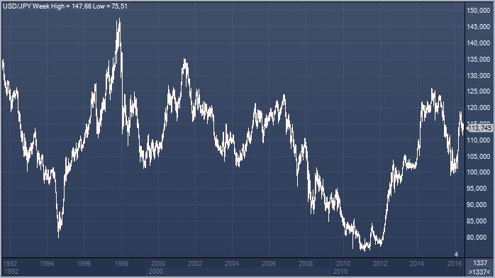 Это не первый раз, когда японские чиновники ссылаются на курс иены до крушения Lehman Brothers в качестве линии разметки. В июне 2015, когда иена окунулась до десятилетнего минимума 125.86, глава Банка Япония Харухико Курода заявил, что валюта вряд ли ослабнет еще сильнее в реальном эффективном выражении, если исходить из различия в темпах инфляции среди основных торговых партнеров страны. После катастрофы с Lehman Brothers иена испытала на себе спрос актива-убежища, поучаствовав в трехлетнем восходящем тренде, в ходе которого был достигнут пик 75.35 в 2011 году. Эта сила нацвалюты нанесла серьезный урон японским экспортерам, лишая их доли рынка и прибыли, наряду с производственными рабочими местами.