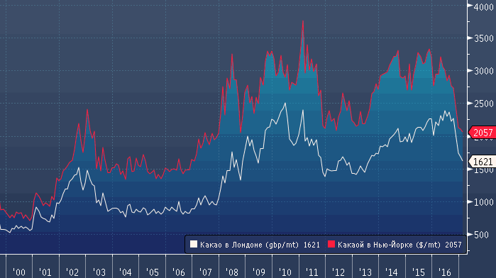 * отличия в динамике обусловлены тем, что какао, торгуемый в Лондоне, является одним из немногих представителей рынка сырья, чья цена установлена в фунтах. В свете Брекзита и девальвации британской валюты, цена какао демонстрировала лучшую динамику, нежели на американском рынке. Трейдеры, поставляющие какао бобы из Западной Африки отдают предпочтения контрактам в Лондоне.