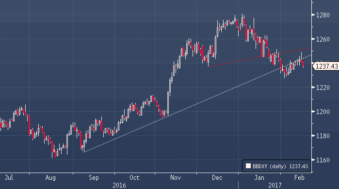 Аналитики Bank of America Merrill Lynch сохраняют оптимизм относительно перспектив американской валюты, но подчеркивают, что в ближайшее время ее динамика может оказаться не столь позитивной. Евро/доллар обозначил закрытие ниже 50-дневной скользящей средней, но сумел удержаться выше 61.8% от роста с минимумов этого года и сформировал молот, а индикатор TD Setup подал бычий сигнал, так что краткосрочные риски смещены в пользу развития коррекции (что мы и наблюдаем). Индекс доллара BBDXY (Bloomberg Dollar Spot Index*), тем временем, сформировал вершину, и попытки вернуться выше линии шеи и бывшей линии тренда оказались неудачными. Активизация продавцов доллара на фоне роста на данных по розничным продажам и инфляции также не сулит быкам ничего хорошего в ближайшее время. Об улучшении перспектив можно будет говорить, когда число кроссов доллара, торгуемых выше 200-дневных скользящих средних, превысит 20 (на данный момент их 16). Более широкое укрепление доллара и возвращение индекса выше пробитой линии шеи может устранить сигналы медвежьей дивергенции на месячном графике, которые пока говорят в пользу развития коррекции в этом квартале.