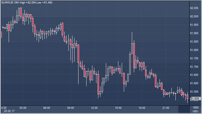 По итогам торгов в понедельник 20 февраля курс доллара по отношению к российской валюте снизился на 45 копеек и составил 57.96 за единицу американской валюты. Курс евро упал на 41 копейку до 61.51 рубля за единицу европейской валюты (прим. ProFinance.ru: по состоянию на 23:50 мск)