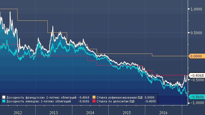 Изменения в опросах не проходят незамеченными рынками: немецкие государственные облигации популярны как никогда, и доходность по ним сегодня достигла свежих минимумов, евро остается под давлением, а французские облигации активно продают — доходность двухлетних бумаг сегодня продолжила ралли и достигла максимального уровня с начала мая прошлого года.