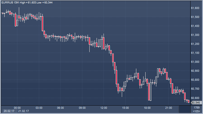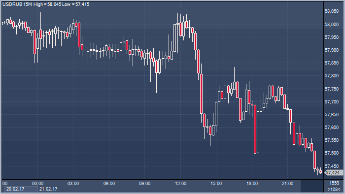 По итогам торгов во вторник 21 февраля февраля курс доллара по отношению к российской валюте снизился на 52 копейки и составил 57.43 за единицу американской валюты. Курс евро упал на 98 копеек до 60.54 рубля за единицу европейской валюты (прим. ProFinance.ru: по состоянию на 23:50 мск)