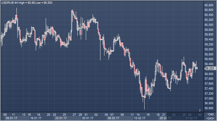 Сегодня утром рубль торгуется на уровне 58.35 против доллара. Более того, напомним, что основные налоговые платежи российских экспортеров за февраль уже завершились, что лишает рубль дополнительной поддержки. Более высокие выплаты по внешнему долгу в марте и общий негатив на рынках развивающихся валют может спровоцировать дополнительное ослабление российской валюты в марте. Мы прогнозируем ослабление рубля в ближайшие дни до уровня 59 рублей за доллар, сообщила главный аналитик Nordea Ольга Лапшина. Источник: ProFinance.Ru - Новости рынка Форекс