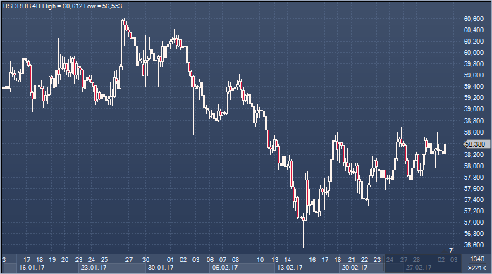В отсутствие собственных драйверов рублю ничего не остается как продолжать ходить за нефтью. Если раньше на рынке обсуждалась тема возможного смягчения санкций США в отношении России, то теперь, после риторики Трампа, новостей на этом фронте и тем более прорывов не ожидается. Словесные и реальные интервенции российских властей, направленные на предотвращение чрезмерного укрепления рубля, также перестали играть роль определяющего котировки фактора. Поэтому вакуум, как всегда, заполняет нефть. А поскольку нефтяной рынок в целом остается в диапазоне, то и торги по рублю сейчас носят довольно скучный характер. В основном все движения распределяются между долларом и евро к рублю, потому что активно движется пара евро/доллар на форексе, а корзина рубля остается в целом без изменений.