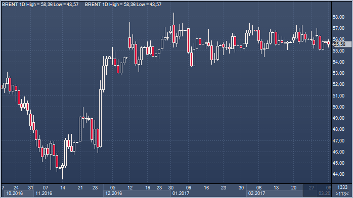 Цены на нефть на данный момент сформировали новый диапазон. Аналитики прогнозируют, что нефть, по крайней мере, в ближайшее время будет оставаться в текущем узком коридоре в $50-60 за баррель, так как на цены влияют два разнонаправленных фактора: сокращение предложения ОПЕК и рост предложения в США. Динамика спроса оставлена за скобками. Это должно несколько успокоить рынок, который за последние три года подвергался резким колебаниям цен. Опрос 15 инвестиционных банков, который провела газета Wall Street Journal в конце февраля, указывает, что нефть Brent в этом году будет стоить в среднем $57 за баррель. Этот прогноз в целом не изменился по сравнению с предыдущим опросом. Прогноз по цене нефти WTI составляет $55 за баррель. В понедельник нефть Brent торгуется на $55.48 за баррель, тогда как нефть WTI - по $52.88 за баррель. Нефть продолжает снижаться на фоне укрепления доллара по отношению к основным мировым валютам, а также на сообщениях относительно экономического роста Китая. В 2016 году темпы роста ВВП Китая замедлились до 6.7% с 6.9% в 2015 году, что стало худшим показателем за последние 26 лет.