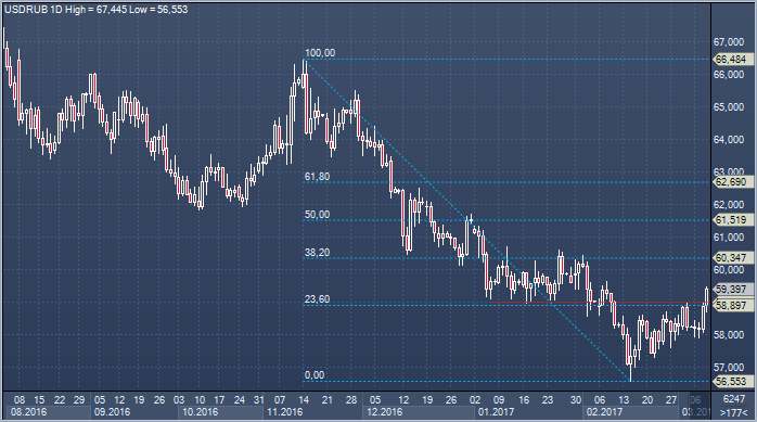 Агрессивная коррекция цен на нефть, имеющая шансы получить дальнейшее развитие, стала хорошим доводом для продажи рубля: курс доллара к рублю сегодня прорвался выше отметки в 59 рублей, и в настоящее время продолжает настойчиво тестировать оборону медведей поблизости от 59.45, прибавляя 50 копеек. Прорыв выше откроет дорогу к 60.00/34, при этом в целом есть шансы увидеть развитие коррекции в направлении 61.50 рублей за доллар. Курс евро к рублю, тем временем, пользуясь некоторым улучшением тона торгов в евро/долларе и эффектом от прорыва выше 62.20, прибавляет 79 копеек. Точкой притяжения выступает сопротивление в районе 62.90/63.08 (23.6% от снижения с ноября и 61.8% от движения с начала февраля), и прорыв выше обещает придать импульс для развития восстановления в направлении 64/65 рублей за евро.
