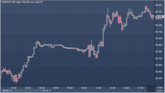 По итогам торгов в четверг 9 марта курс доллара по отношению к российской валюте вырос на 114 копеек и составил 59.32 за единицу американской валюты. Курс евро увеличился на 125 копеек до 62.79 рубля за единицу европейской валюты (прим. ProFinance.ru: по состоянию на 23:50 мск). Прирост к уровням закрытия во вторник 7 марта, так как 8 марта торги на Мосбирже не проводились.
