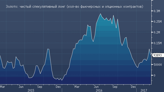 Как следует из последнего отчета CFTC, за неделю до 7 марта крупные спекулянты сократили объем чистой длинной позиции во фьючерсах и опционах на золото на 27 827 контрактов до 93 893 контрактов (в предыдущий отчетный период он достиг 15-недельного максимума).