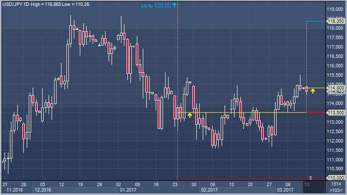 Доллар/иена. 13 марта: покупка от 114.80, целью 118.35, стоп 113.50