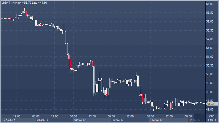 Цены на нефть марки WTI торгуются ниже 49 долларов за баррель на фоне того, как эксперты прогнозируют 10-ую неделю к ряду увеличение объема запасов коммерческой нефти в США. Предыдущие 6 торговых сессий привели к падению нефтяных котировок на чуть более чем 9%. Одним из ключевых событий текущего дня будет публикация ежемесячного отчета ОПЕК, в котором будут отражены производственные показатели за февраль.