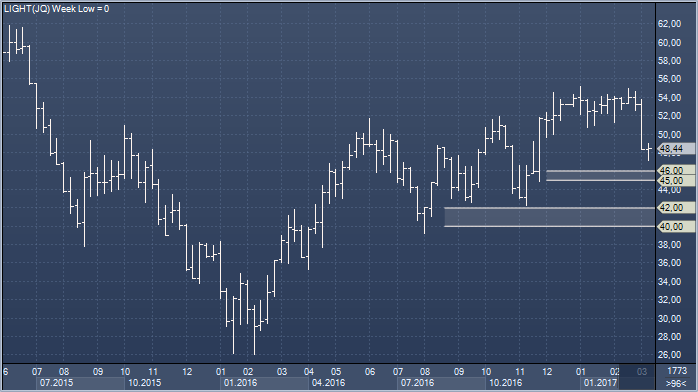 Ближайший фьючерс на WTI торгуется в области минимальных значений с конца прошлого ноября (отметка $47.20 представляет собой коррекцию 61.8% от роста после победы Дональда Трампа). Прорыв ниже создаст предпосылки для дальнейшего снижения к $45-$46, а в более долгосрочной перспективе нельзя исключить и теста области $40-$42.
