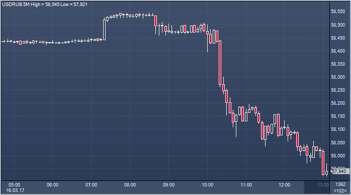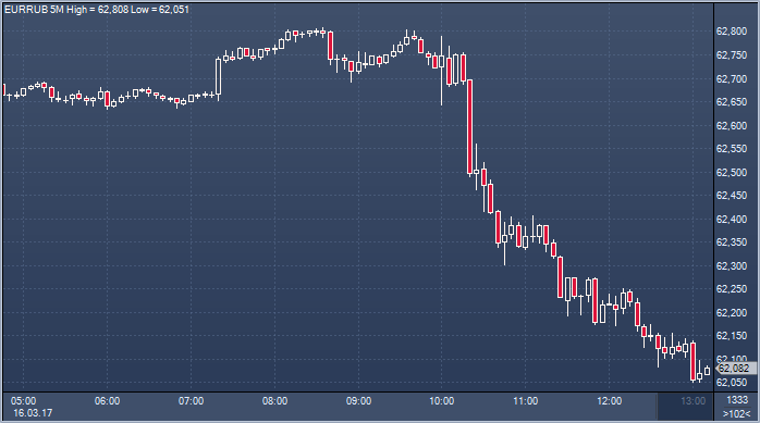 Таким образом, по официальному курсу ЦБ доллар упал к рублю на 87 копеек, а евро упал к рублю на 36 копеек по сравнению с официальным курсом четверга. Объем сделок на Московской бирже к 13:11 мск четверга составил 1 179.8260 млрд рублей или 19 958.8928 млн долларов. Курс рубля растет сегодня в ответ на решение ФРС повысить ставку и обещание делать это в дальнейшем постепенно. ФРС не стала менять прогноз количества повышений ставко в этом году, как опасались некоторые, что спровоцировало продажу доллара, рост акций и других рисковых активов. Цены на нефть выросли после выхода в США данных о сокращении запасов сырья. Далее рубль получит поддержку налогового периода.