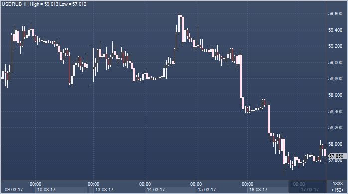 Рубль остается крепким, сохраняя позитивную динамику после решения FOMC по ставке. Впереди у рынка мартовский налоговый период, что традиционно поддерживает отечественную валюту. Кроме того, Владимир Путин внезапно заявил на форуме РСПП о том, что «необоснованное и преждевременное снижение ставки может привести к инфляции и к ослаблению национальной валюты». По его мнению, ослабление рубля уменьшит возможности закупки нового оборудования, повышающего производительность труда. Напомним, что мы предполагали возможное снижение процентной ставки на следующей неделе в качестве вероятного триггера для возвращения курса рубля в область 59 против доллара, после заявлений президента эта идея становится несколько менее реальной.