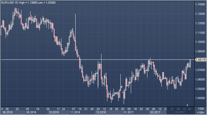 Эрик Теорет, FX-стратег Scotiabank, видит возможность для роста пары евро/доллар в краткосрочной перспективе. «Евро получает поддержку положительных настроений, формированию которых способствовала перемена в позиции ЕЦБ, который рассматривает возможность повышения ставки из отрицательной области до завершения количественного смягчения, а также ослабление политических рисков во Франции после вчерашних дебатов. Спред доходности 2-летних облигаций Германии и США снизился почти на 20 б.п. после заседания ЕЦБ 9 марта, оказав значительную поддержку EUR. Тем не менее, мы считаем сдвиг в тональности преждевременным и продолжаем обращать внимание Драги на низкие показатели базовой инфляции. Это мнение было поддержано комментариями президента Bundesbank Вейдманна в понедельника, когда он сосредоточился на «слабом» ценовом давлении.
